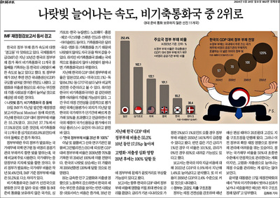 〈조선일보〉 보도에 따르면 ‘나랏빚 늘어나는 속도가 비기축통화국 중 2위’라고 한다. 기사를 보니 “IMF는 지난 10년간 한국의 정부부채 증가 폭이 비기축통화국 11개국 중 둘째를 기록하는 등 한국의 나랏빚이 빠른 속도로 늘고 있다고 했다”라고 한다. 그러나 IMF(국제통화기금)는 그런 말을 한 적이 없다. IMF가 그런 말을 한 것이 아니라 IMF의 보고서를 특정 언론이 그렇게 해석했을 뿐이다. 기자 본인의 주장을 IMF의 입을 빌려서 말하는 것은 바람직하지 않다.비기축통화국 중 2위라는 기사의 주장도 지나치게 자의적이다. 기사
