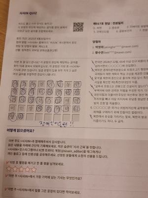 이름: 김우림(26)지역: 독일 프랑크푸르트해외에 나갈 일이 있으면 그 지역 서점을 둘러보곤 한다. ‘시장조사’ 나온 것도 아닌데 아무래도 잡지 매대에 주로 눈길이 간다. 〈시사IN〉과 비슷한 시사 주간지는 무엇인지, 지면 디자인은 어떻게 하는지···. 9월 초 〈시사IN〉 X(옛 트위터) 계정으로 “독일인 애인이 한국 출장을 갔다가 〈시사IN〉을 사왔다”라며 함께 퀴즈를 풀었다(사진)는 멘션을 받고 ‘독자와의 대화’를 불쑥 요청했다. 출장길에 굳이 다른 나라 언어로 된 주간지를 사는 외국인이 있다니 반가운 마음이 먼저였다. 또 어