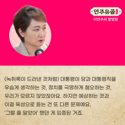 인터넷 매체 ‘시민언론 더탐사’가 지난 5일 공개한 녹취록이 파장을 일으켰습니다. 해당 녹취는 지난 2021년 당시 검찰총장이었던 윤석열 대통령과 국민의힘 관계자의 대화입니다. "민주당보다 국민의힘을 더 싫어한다", "(정권교체를 하려면) 국힘을 갖다가 플랫폼으로 할 수밖에 없다는 걸 인정을 하셔야 된다", "대통령 자리 자체가 귀찮다"라는 녹취록 속 윤 대통령의 발언을 통해 그가 당시 국민의힘 입당을 선택한 배경을 짐작해 볼 수 있습니다.국민의힘 정당과 그 지도부를 무시하는 윤 대통령의 속내가 낱낱이 드러났음에도 불구하고, 정작