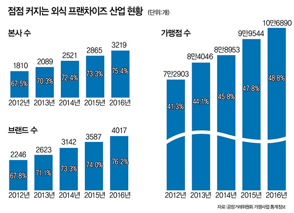 이런 구조에서 프랜차이즈 본사라고 해서 다들 배만 불리고 있을까. 그렇지 않다. 자영업 홍수 속에서 프랜차이즈 본사도 과당경쟁의 피해자가 되고 있다. 통계가 말해준다. 공정거래위원회 통계에 따르면 2012년 1810개였던 외식업 프랜차이즈 본사의 수는 2016년 3219개로 크게 늘었다(위쪽 표 참조). 4년 동안 두 배 가까이 증가했다. 전체 프랜차이즈 본사 가운데 외식업이 차지하는 비율도 2012년 67.5%에서 2016년 75.4%로 늘었다. 외식업 브랜드 수 역시 2012년 2246개에서 2016년 4017개로 두 배 가까이 늘었다. 외식 프랜차이즈 본사가 난립하면서 각종 브랜드도 늘어난 것이다. 그 결과 한 달에 가맹점 하나 늘리기 어려운 프랜차이즈 업체도 수두룩하다는 게 업계 관계자의 전언이다.