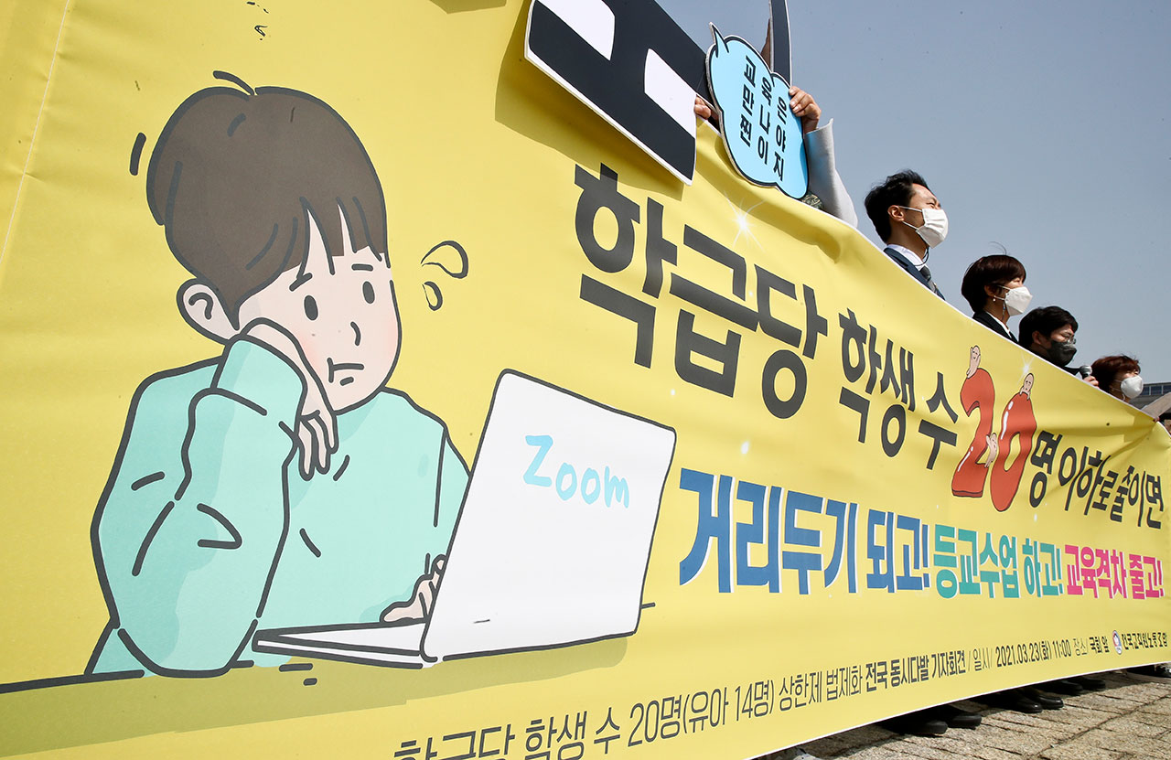 교육부는 ‘그린 스마트 스쿨’ 사업과 AI 교육 등 미래 교육을 이야기한다. 교원 백신접종 완료와 방역 강화를 바탕으로 9월 전면 등교를 이야기하고 있다. 하지만 가장 중요한 학급당 학생 수 감축에 대한 논의는 장기 과제로 미뤄뒀다.