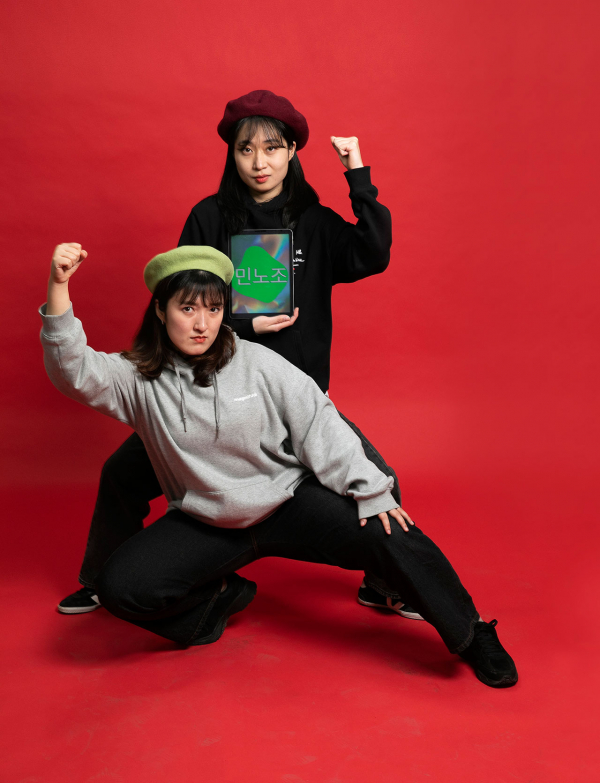 인터뷰를 하다 말고 눈들이 반짝였다. 촬영된 사진을 보다 엠넷의 인기 프로그램 〈스트릿 우먼 파이터(스우파)〉가 떠오른다는 이야기가 오가던 차였다. “스노파 어때? 스트릿 노조 파이터.” 조선희씨(29·앞)가 운을 뗐다. 노조를 만들었거나, 만들고 싶어 하는 다른 시민단체 활동가들을 모으자는 아이디어였다. 고은지씨(31·뒤)가 “괜찮은데?” 하며 맞받았다. 노조 이미지를 어떻게 하면 가볍고 재밌게 바꿀 수 있을까가 최근 이들의 고민이었다. “모집 포스터도 만들자” “필리버스터도 하자”라며 진지함과 웃음기 섞인 대화가 한동안 이어졌다. “이렇게 동료들과 잘 맞으니까 제가 못 떠난 거예요.” 퇴사를 한 200번 정도 생각했다던 고은지씨가 말했다. 현재 언론 시민단체 민주언론시민연합(민언련) 노조 위원장이다.