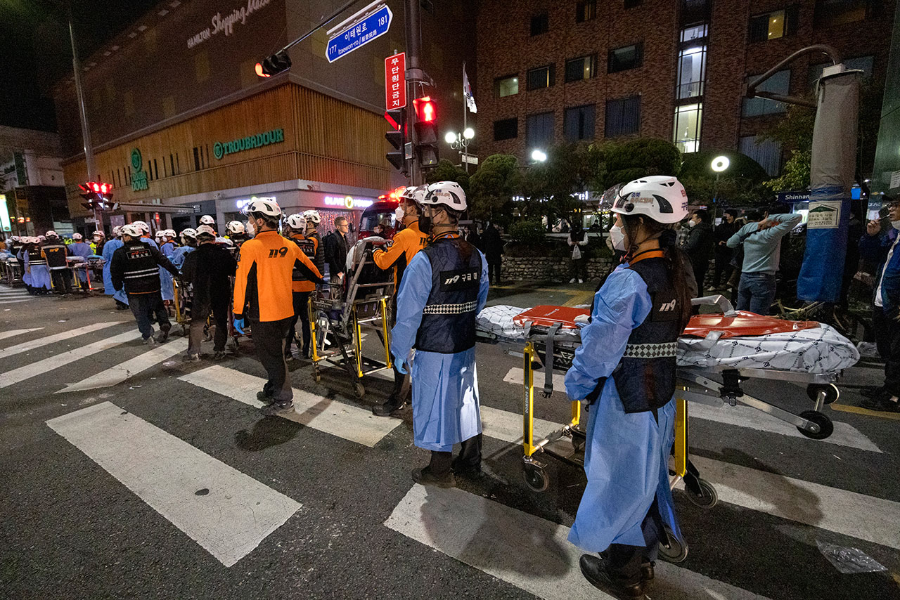 이태원 참사 현장에서 구급대원들이 희생자들을 병원으로 이송하기 위해 대기하고 있다. ⓒ시사IN 조남진