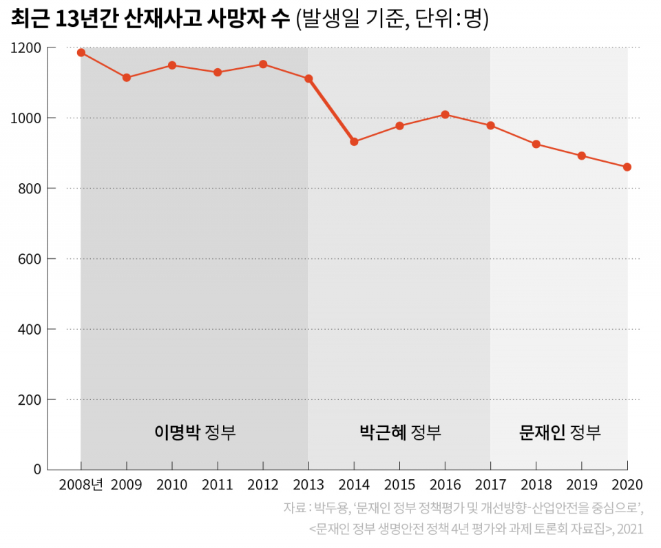 이 데이터를 계산한 박두용 전 안전보건공단 이사장은 “해당 기간에 특별히 산업안전 제도가 바뀐 건 없다. 예산이나 인력이 크게 늘지도 않았다. 그런데도 산재 사망이 이만큼 줄어든 건, ‘사고 나면 큰일 난다’라며 기업도, 일하는 사람도 극도로 조심했다고 봐야 한다. 세월호 참사 직후 ‘안전’이 강조되던 사회적 분위기 말고는 달리 설명하기 어렵다”라고 말했다.