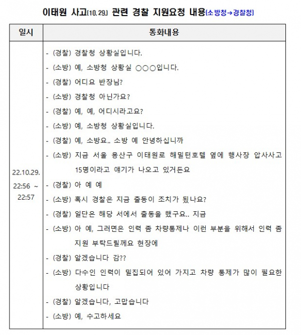 하지만 〈시사IN〉이 해당 녹취록을 확인한 결과, 윤희근 경찰청장의 증언은 사실과 달랐다. 10월29일 22시56분 소방청 상황실은 경찰청 상황실에 유선전화를 걸었다. 소방청 상황실 관계자는 “지금 서울 용산구 이태원로 해밀턴호텔 옆에 행사장 압사 사고 15명이라고 얘기가 나오고 있거든요”라고 상황을 전했다. 경찰청 상황실 관계자 또한 그 발언에 “아, 예. 예”라고 답했다. 윤 청장의 발언과 달리 소방 당국이 경찰에 사고 규모를 전파했고, 경찰도 그 전파에 답했다는 사실이 해당 녹취록에 기록되어 있었다.