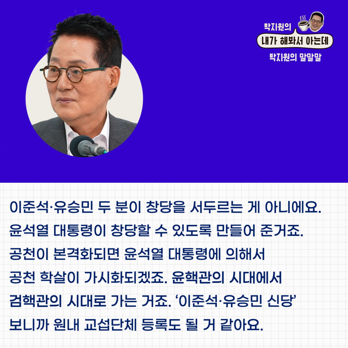 "국민의힘은 신당 창당으로 갈 수밖에 없어요. 윤석열 대통령을 보면 미래를 예측할 수 있어요. 그분이 민주주의자가 아니라 ‘검찰주의자’예요. 모든 정치를 수사하듯 한단 말이에요. ...