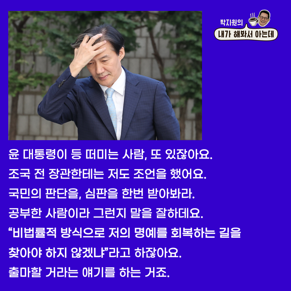 윤 대통령이 등 떠미는 사람, 또 있잖아요. 조국 전 장관한테는 저도 조언을 했어요. 국민의 판단을, 심판을 한번 받아봐라. 공부한 사람이라 그런지 말을 잘하데요. “비법률적 방식으로 저의 명예를 회복하는 길을 찾아야 하지 않겠냐”라고 하잖아요. 출마할 거라는 얘기를 하는 거죠.