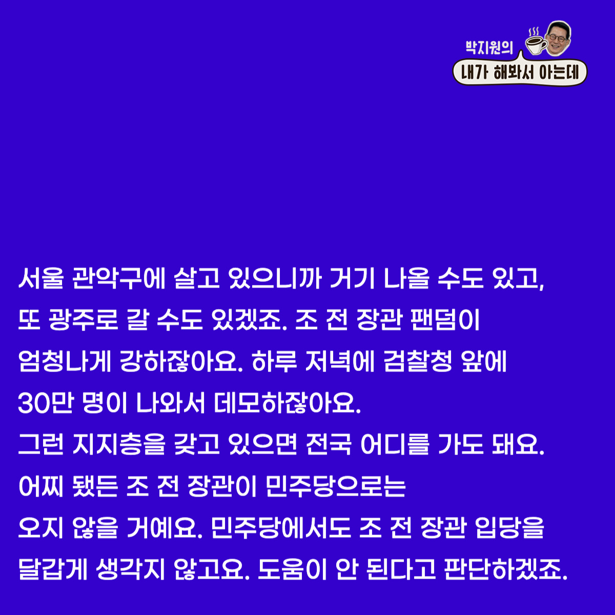 서울 관악구에 살고 있으니까 거기 나올 수도 있고, 또 광주로 갈 수도 있겠죠. 조 전 장관 팬덤이 엄청나게 강하잖아요. 하루 저녁에 검찰청 앞에 30만 명이 나와서 데모하잖아요. 그런 지지층을 갖고 있으면 전국 어디를 가도 돼요. 어찌 됐든 조 전 장관이 민주당으로는 오지 않을 거예요. 민주당에서도 조 전 장관 입당을 달갑게 생각지 않고요. 도움이 안 된다고 판단하겠죠.