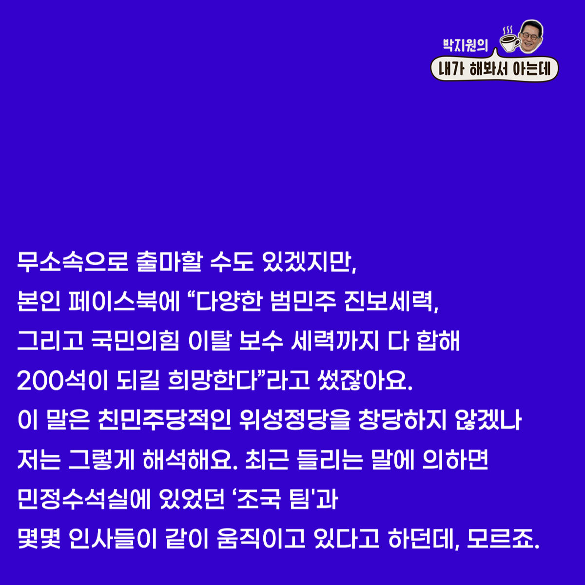 무소속으로 출마할 수도 있겠지만, 본인 페이스북에 “다양한 범민주 진보세력, 그리고 국민의힘 이탈 보수 세력까지 다 합해 200석이 되길 희망한다”라고 썼잖아요. 이 말은 친민주당적인 위성정당을 창당하지 않겠나 저는 그렇게 해석해요. 최근에 들리는 말에 의하면 민정수석실에 있었던 ‘조국 팀'과 몇몇 인사들이 같이 움직이고 있다고 하던데, 모르죠."