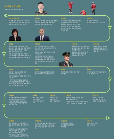 2023년 7월20일 해병대 1사단 소속 채 아무개 상병이 경북 예천에서 폭우 피해 실종자를 수색하던 중 숨졌다. ‘채 상병 순직 사건’을 조사하던 해병대 수사단은 열흘 후인 7월...