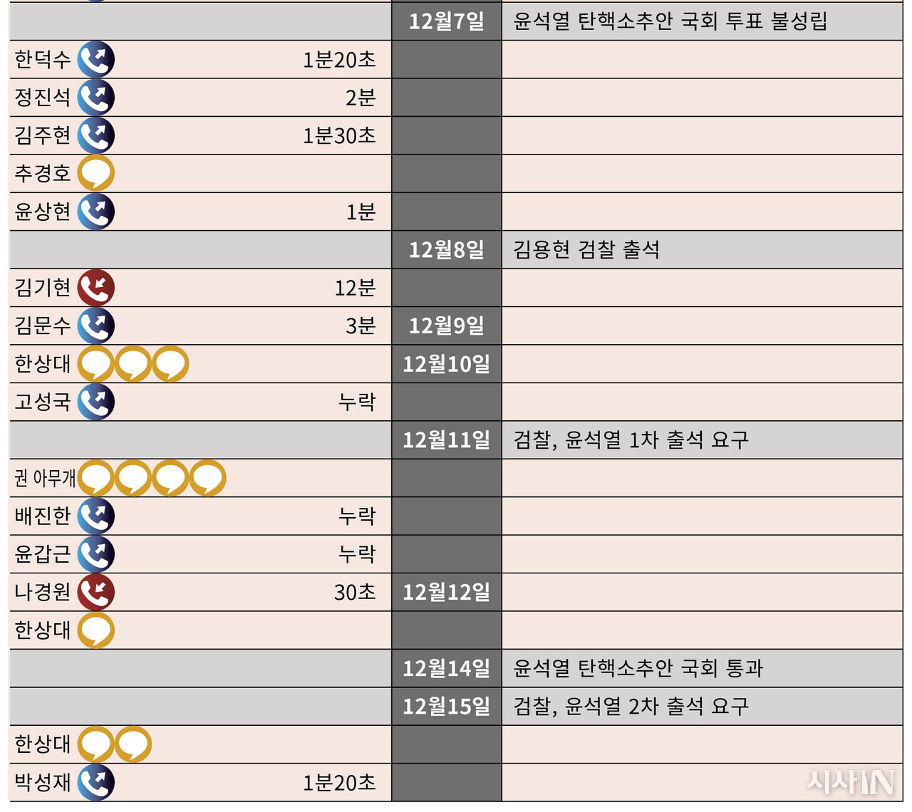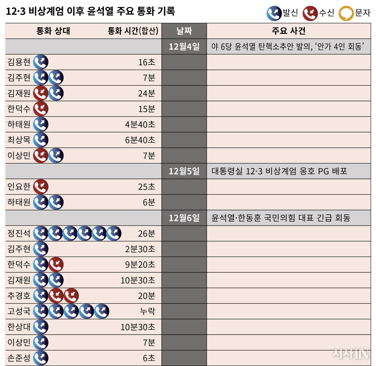 대표적인 통화 상대가 추경호 국민의힘 원내대표다. 윤석열은 한동훈 대표와 회동이 종료된 직후인 2024년 12월6일 오후 1시55분 추 원내대표에게 전화를 걸었다. 이후 오후 2시16분과 오후 5시55분에는 추 원내대표에게서 걸려온 전화를 받아, 이날 하루 세 차례 약 20분간 그와 통화했다. 추 원내대표는 12·3 비상계엄 당일 계엄군이 국회에 도착하기 30분 전 윤석열의 전화를 받은 인물이다. 그는 이때 윤석열이 “미리 이야기하지 못해 미안하다고 말하며 짧게 통화가 끝났다”라고 주장했다. 이 밖에도 윤석열은 12월6일 김재원 전 최고위원(현 김문수 국민의힘 대선후보 비서실장)과 두 차례(총 10분30초), 한덕수 국무총리와 두 차례(총 9분20초), 이상민 행정안전부 장관과 한 차례(7분) 통화했다.