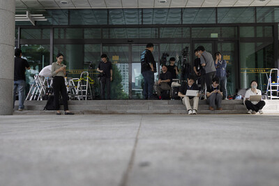 7월1일 오전 서울 서초구 서울고등검찰청 정문 포토라인 앞. 이날은 원래 내란 특검 피의자 윤석열이 출석하기로 한 날이었다. 하지만 윤석열은 나타나지 않았고 취재진만 앉거나 서서 ...