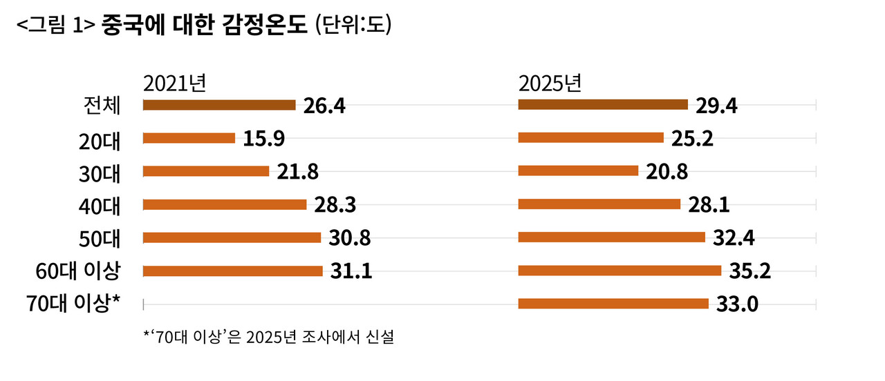 2025년 조사에서 중국에 대한 감정을 온도로 물었을 때 여전히 2030은 반중 정서를 이끌어가는 집단이다(〈그림 1〉 참조). 20대는 25.2도, 30대는 20.8도로 평균(29.4도)보다 낮다(0에서 100도로 갈수록 긍정적). 감정온도가 가장 높은 60대(35.2도)와는 10~15도 가까이 차이가 난다. 다만 청년층의 반감이 2021년보다 심화된 징후는 없다. 20대 감정온도는 오히려 9.3도 올랐다. 30대는 1도 떨어졌다. 중국 사람에 대한 감정도 추세는 비슷하다. 윗세대보다는 차갑지만 4년 전보다는 온도가 올랐다. 20대는 18.2도에서 24.5도로 올랐고, 30대는 21.5도에서 20.9도로 근소하게 떨어졌다.