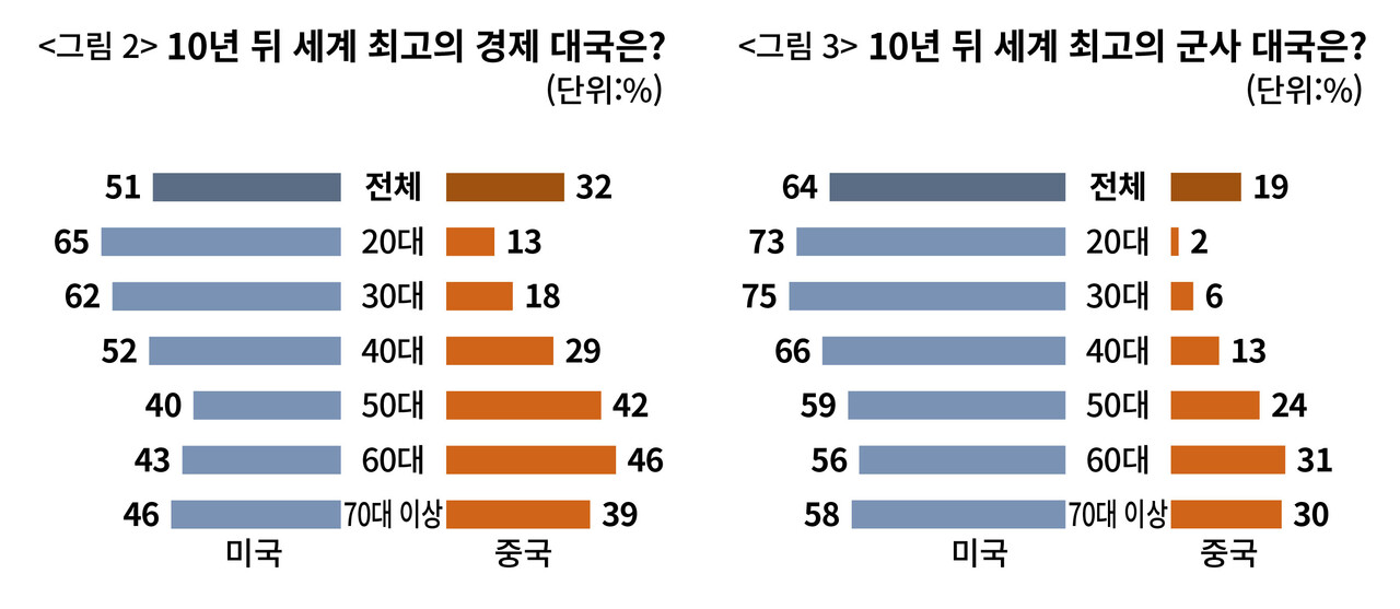 그러나 2030 전체적으로는 한·중 관계 훼손, 나아가 중국을 그리 두려워하지 않는다. 미국과 중국 간 경쟁 구도에 대한 인식 때문이다. 중국이 아닌 미국의 패권을 낙관하는 쪽으로 쏠린다. ‘중국은 조만간 미국의 종합 국력을 넘어설 것’이라는 주장에 대해 20대는 20%, 30대는 19%만 동의했다. 윗세대가 30%부터 최대 44%까지(60대) 동의하는 것과 대조된다. 10년 뒤 세계 최고 경제·군사 대국을 물었을 때도 마찬가지였다(〈그림 2〉 〈그림 3〉 참조). 중국이 최고 경제 대국이 될 것이라 내다본 20대는 13%, 30대는 18%에 불과했다(평균 32%). 50대 이상에서 40%대로 내려앉은 ‘미국’ 응답이, 2030 세대에서는 각각 65%, 62%가 나왔다. 10년 뒤 최고의 군사 대국을 중국으로 꼽은 20대는 단 2%, 30대는 6%였다.